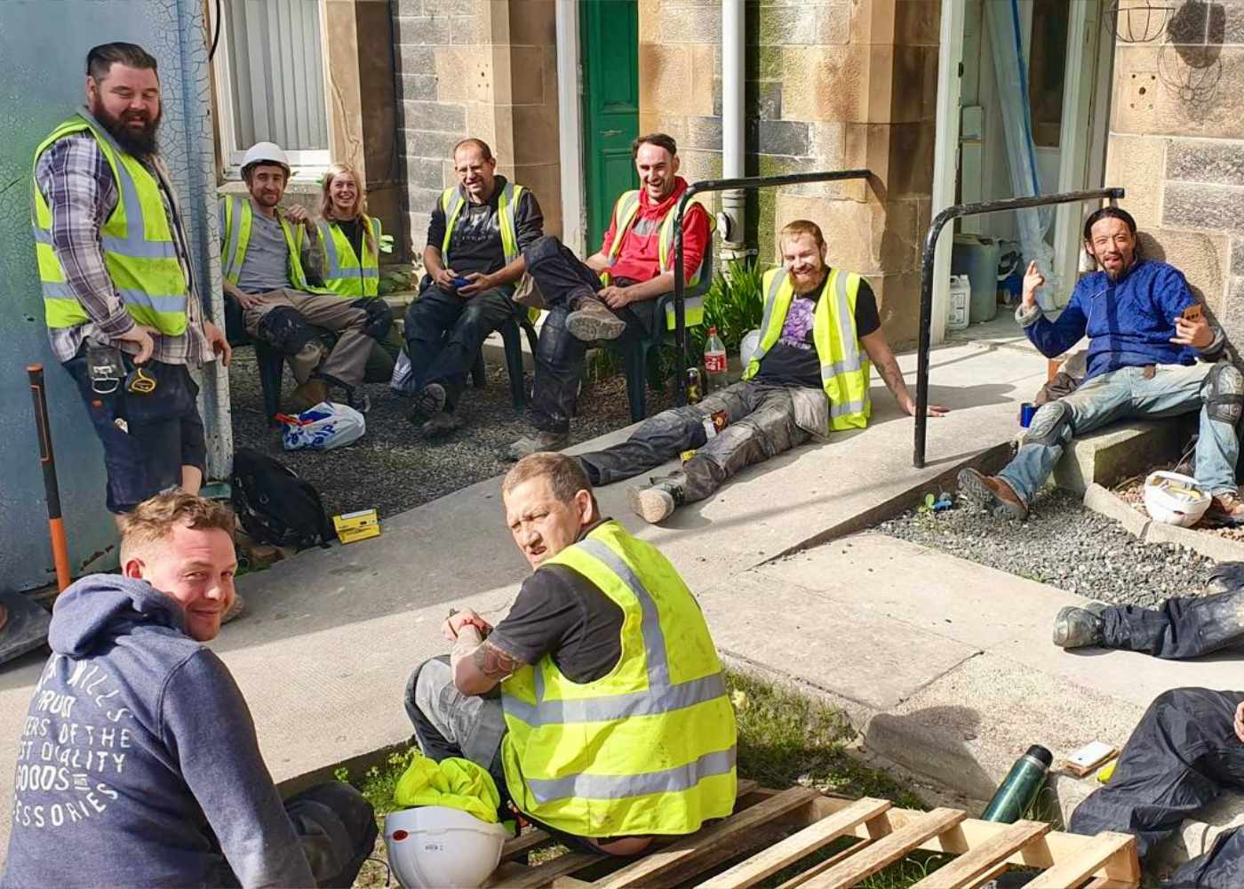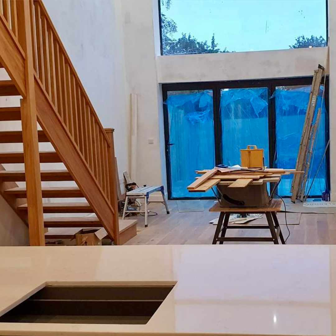 We completely stripped out an old townhouse in Musselburgh.  Reconstructed, it features a massive open-plan kitchen living areas and mezzanine floors.  The gable end was demolished and replaced with an open glazed frame.  We worked on this job for about a year with a whole team of tradespeople.  The project was managed by Nick Yeats.